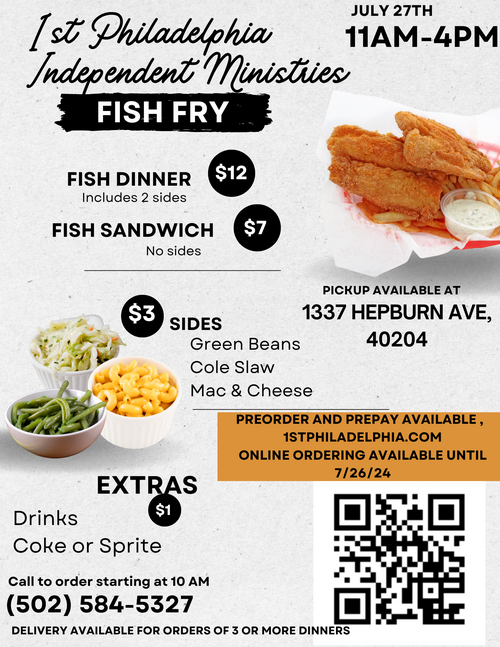 Get ready for fish, just in time for lent we will be selling fish dinners right around lunch time for $12.00 and fish sandwiches for $7.00. Each fish dinner comes with fish, two sides, and is available to preorder to guarantee you will not miss out. Delivery available for orders of 3 or more within a 10 mile Radius of 1337 Hepburn Ave. Order for delivery or pick-up. Pre-order your meal today to secure your food because we are only selling 150. So once they're gone....they're gone. Group orders welcome! Phone delivery orders are card only. Once you place the order you will be sent an electronic invoice to pay via debit/credit to secure your order. phone orders will begin at 10:00 AM